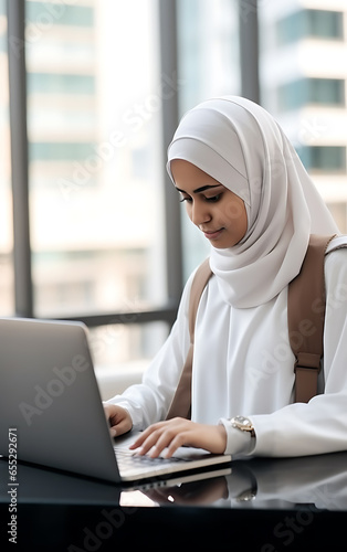 Young arab woman in hijab using laptop in coworking space, remote work concept