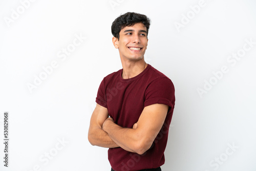 Young Argentinian man isolated on white background with arms crossed and happy