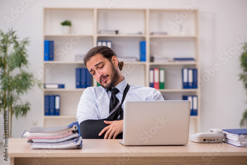 Young arm injured male employee working in the office