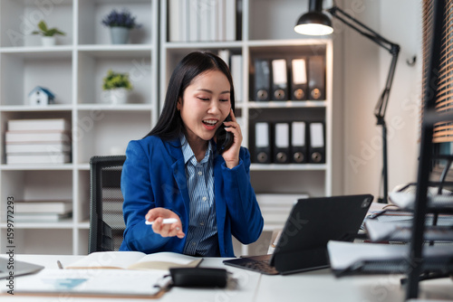 Young Asian businesswoman talking on phone and working with digital tablet in modern office, smiling and holding a pen while looking at her tablet