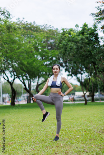 Young asian female exercise in park in morning, Happy and smiled woman workout and relax before fitness training, warm up concept