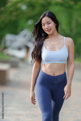 fitness, model, asian, woman, park, walking, activewear, health, wellness, active, lifestyle, exercise, outdoors, nature, confident, happy, healthy, beauty, slim, fit, physical exercise, training, recreation, leisure, summer, daytime, sunlight, tree, green, serene, peaceful, calm, calmness, relaxation, well-being, motivation, inspiration, portrait, fashion, style, athletic, body, leggings, sport, bra, long, hair