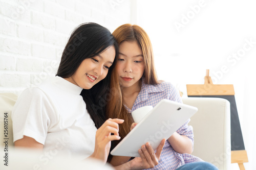 Young asian happy woman .women shopping online .Young girl thinks about purchasing through the internet sitting on the sofa.woman holding credit card and using laptop computer. Online shopping concept