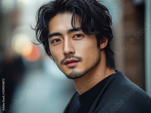 Young Asian Man with Stylish Hair and Serious Expression Outdoors