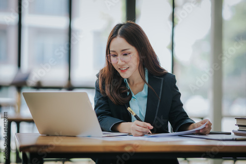 Young Asian professional business woman office worker analyst sitting at desk working on laptop thinking on project plan, analyzing marketing or financial data online, watching elearning webinar.