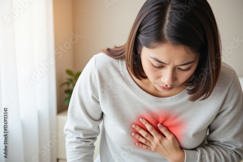 Young Asian Woman Experiencing Chest Pain While Sitting Indoors, Showing Signs of Discomfort and Concern About Potential Health Issues