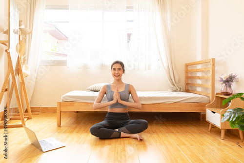 Young Asian woman is exercising yoga at home. Fitness, workout, healthy living and diet concept. Female watching videos online on laptop computer in bedroom.