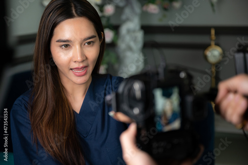 young Asian woman person are live video streaming broadcast technology at home