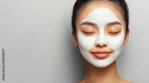 Young Asian woman relaxing with a facial mask on clean skin, demonstrating beauty and skincare treatment, light grey background in spa setting.