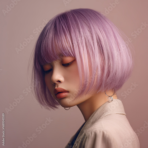 Young asian woman sporting vibrant purple bob haircut, posing confidently in stylish studio portrait with modern fashion aesthetic