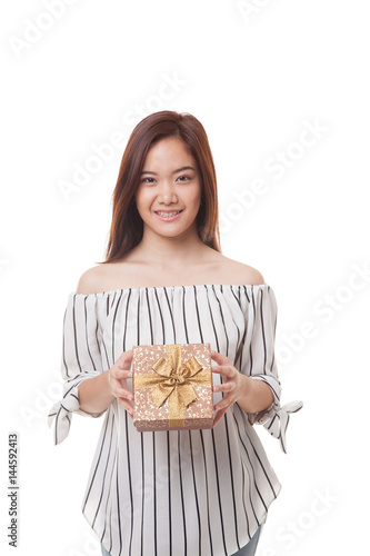anniversary, asian, beautiful, birthday, box, celebrate, christmas, christmas gift, female, gift, girl, give, happy, holiday, lady, merry, new year, person, portrait, season, shopping, smile, studio, valentine, white, woman, christmas, young, isolated