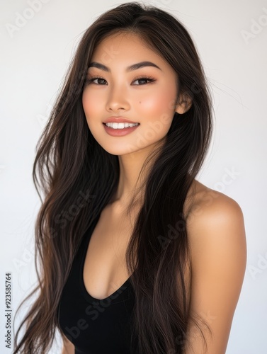 young Asian woman with clean skin and flowing hair, embodying beauty and skincare ideals.