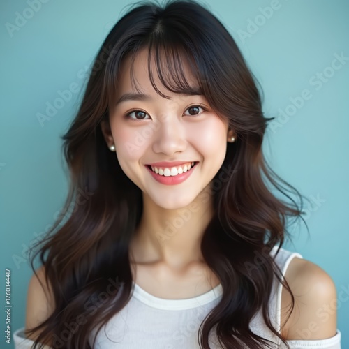 Young Asian woman with long dark wavy hair, bright, happy smile. She has clear skin, wears simple pearl earrings against soft blue background. Her friendly expression radiates positivity, charm.