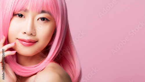 young Asian woman with sleek, vibrant pink hair styled in a chic bob, The composition highlights her flawless skin, glossy lips, softly applied makeup, fashion statement, ideal for beauty, hair