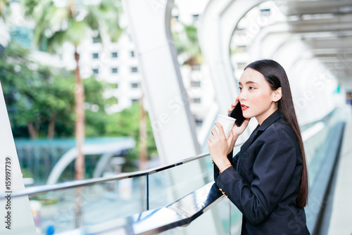 Young Asian woman with smartphone standing against street blurred building background. Fashion business photo of beautiful girl in black casual suite with phone and cup of coffee