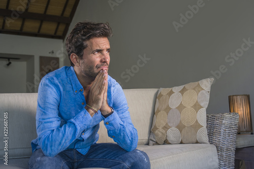young attractive and handsome sad latin man sitting tired and depressed at home sofa couch feeling overwhelmed and worried suffering depression crisis and anxiety