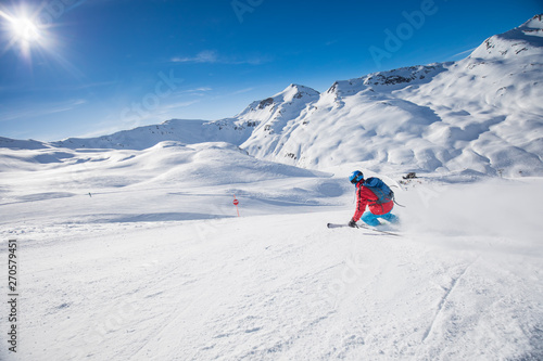 Young attractive skier skiing in famous ski resort in Alps, Livigno, Italy, Europe