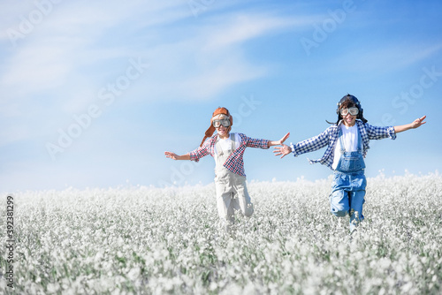 children, children, airman, boy, field, day, pilot, fly, play, dream, imagine, adventure, happy, flight, sunlight, caucasian, happiness, lifestyle, joy, childhood, horizontal, leisure, nature, helmet, imitation, profession, wing, people, concept, fun, sky, cloud, retro, white, blue, summer, goggles, teenage, friendship, activity, enjoyment, relaxation, group, smile, flower, hand, run