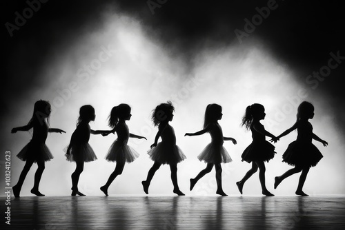 ballet, dancer, ballerina, dance, performance, stage, silhouette, tutu, lighting, art, children, girl, childhood, skill, talent, grace, elegance, movement, choreography, theatre, spotlight, smoke, dramatic, black-and-white, monochrome, performing arts, entertainment, artistic, creative, expression, passion, dedication, training, rehearsal, recital, show, group, team, teamwork, formation