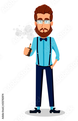 hipster, male, man, cartoon, character, beard, guy, modern, photogenic, smoke, atomizer, cigarette, electronic, smoker, steam, zapped, gentleman, human, design, element, person, standing, goggles, stylish, young, hair, haircut, trendy, coiffure, drawing, style, fashion, beautiful, face, head, successful, caucasian, white, background, white background, graphic, clip art, vector, illustration