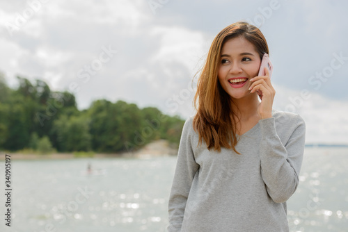 nature, woman, asian, outdoors, people, portrait, young, beautiful, relaxation, leisure, southeast, thai, female, lady, woman, person, adult, attractive, casual attire, landscape, peaceful, lake, finland, nordic, water, sky, duck pond, river, shore, happy, happiness, smile, smiling, phone, mobile, technology, using, holding, smartphone, cyberspace, mobile phone, communication, connection, talking, calling