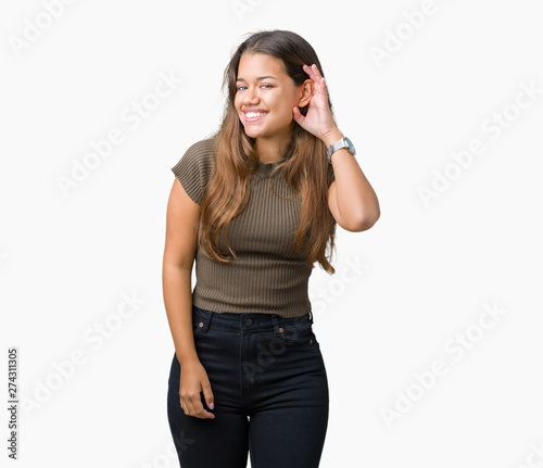 Young beautiful brunette woman over isolated background smiling with hand over ear listening an hearing to rumor or gossip. Deafness concept.