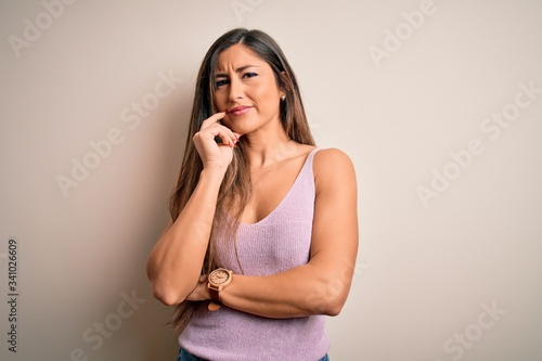 Young beautiful brunette woman with long hair standing over isolated background with hand on chin thinking about question, pensive expression. Smiling with thoughtful face. Doubt concept.