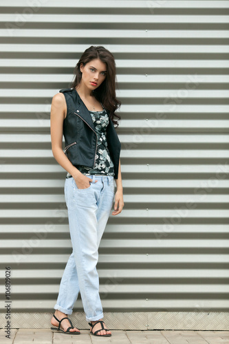fashion, woman, outdoors, beautiful, model, brunette, background, young, modern, shoot, beauty, full, length, happy, portrait, adult, cute, attractive, pretty, lifestyle, spring, summer, style, bright, casual attire, urban, city, leather, jacket, black, shirt, look, metal, strip, pant, sandal, leg, posing, trendy, pose, expression, test, hipster, street, stylish, person, colourful, youth, wearing
