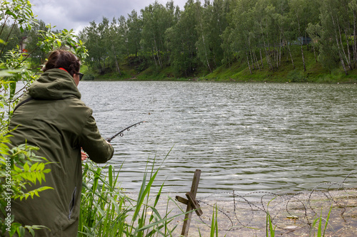 young beautiful fisherman girl fishing with a rod in a large pond at the rain. the woman is wearing the green rain cover. Active sports and relaxation for women