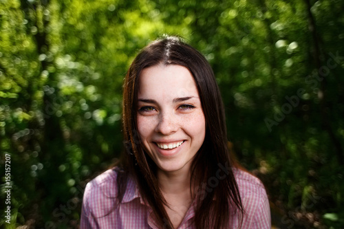 Young beautiful freckled green-eyed laughing woman face with healthy skin and wide smile, close-up portrait.