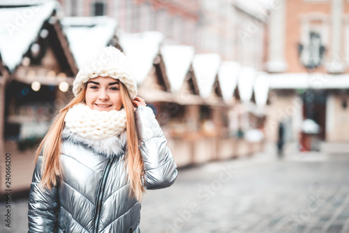 Young beautiful girl walking at the Christmas Fair