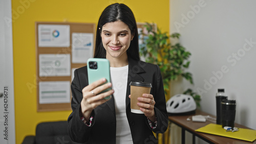 Young beautiful hispanic woman business worker using smartphone drinking coffee at office