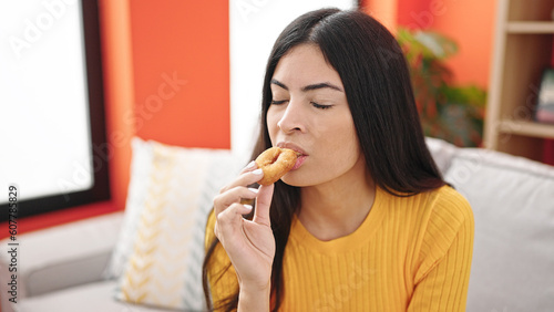 Young beautiful hispanic woman eating doughnut sitting on sofa at home