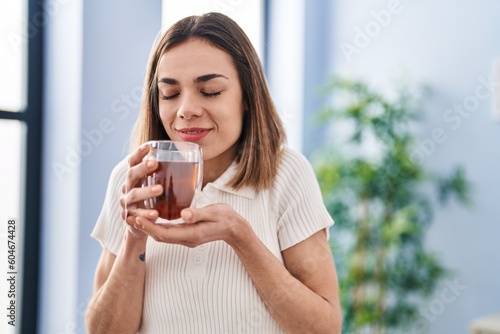 Young beautiful hispanic woman smiling confident smelling tea at home