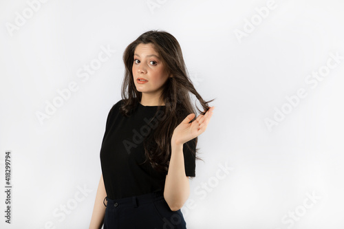 Young beautiful lady stretching her hair with hand and looking to the camera