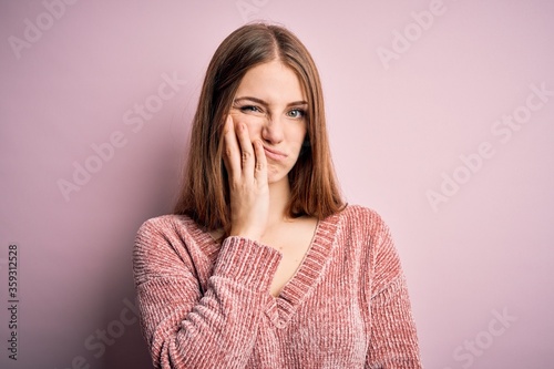 Young beautiful redhead woman wearing casual sweater over isolated pink background thinking looking tired and bored with depression problems with crossed arms.