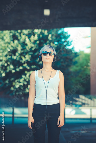 woman, beautiful, rebel, young, blue, listening, music, sunglasses, relaxing, technology, earphones, earphones, player, smartphone, mp3, short, hair, coiffure, hipster, authentic, real, candid, unusual, summer, diverse, diversity, caucasian, modern, lifestyle, style, stylish, beauty, attractive, casual attire, cool, fashionable, female, contemporary, trendy, easy, natural, airy