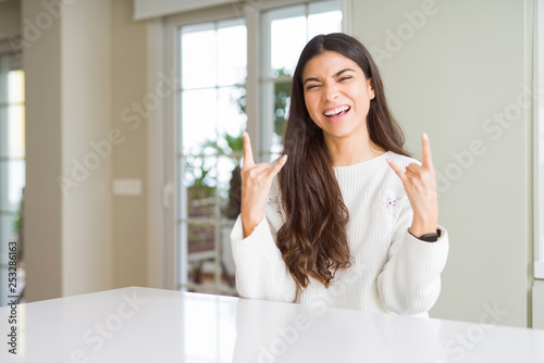 woman, girl, young, adult, indian, arab, hispanic, portrait, indoor, home, beautiful, attractive, long hair, brunette, window, bright, table, white, casual attire, rock, gesture, symbol, hand, signs, people, music, concept, finger, showing, rocker, cheerful, fun, expression, metal, heavy, fashion, cool, arm, hipster, show, gesticulate, devil, star, hand, crazy, party, punk, screaming