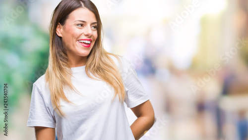 Young beautiful woman casual white t-shirt over isolated background looking away to side with smile on face, natural expression. Laughing confident.