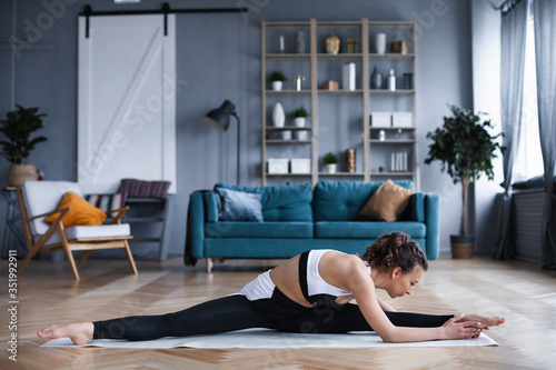 Young beautiful woman in sportswear doing stretching while sitting on the floor on yoga mat at home.