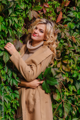 Young beautiful woman in sweater and coat stands next to the background of wild grapes holding bouquet of autumn leaves