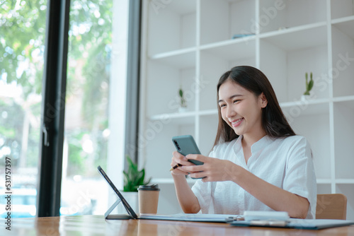 Young beautiful woman is texting and chatting with friends on smartphone at home.