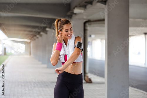 young beautiful woman jogging, fitness outfit, listening to music on headphones, smartphone, sea sunrise, skinny perfect slim body, healthy living lifestyle, summer, smiling, happy