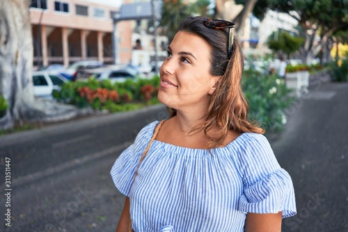 Young beautiful woman smiling happy walking on city streets on a sunny day of summer
