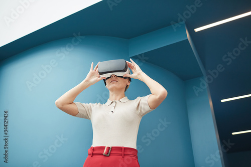 Young beautiful woman wearing virtual glasses watching some virtual reality outdoors