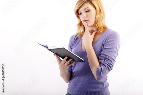 woman, calendar, book, agenda, office, plan, planning, female, person, man, blond, thinking, hand, finger