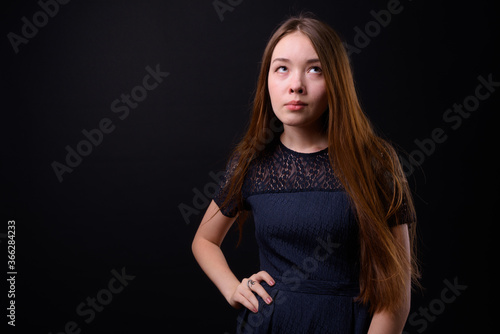 Young beautiful woman with long brown hair against black background