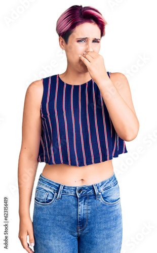 Young beautiful woman with pink hair wearing casual clothes smelling something stinky and disgusting, intolerable smell, holding breath with fingers on nose. bad smell