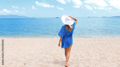 Young beautiful women in the blue tunic on the sunny tropical beach