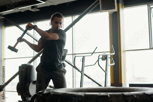 activity, athlete, biracial, body, copy space, energy, equipment, exercise, fitness, functional, health, male, man, modern, motivation, muscle, slam, sledgehammer, sport, strength, strike, tire, training, vitality, wellness, physical exercise, young